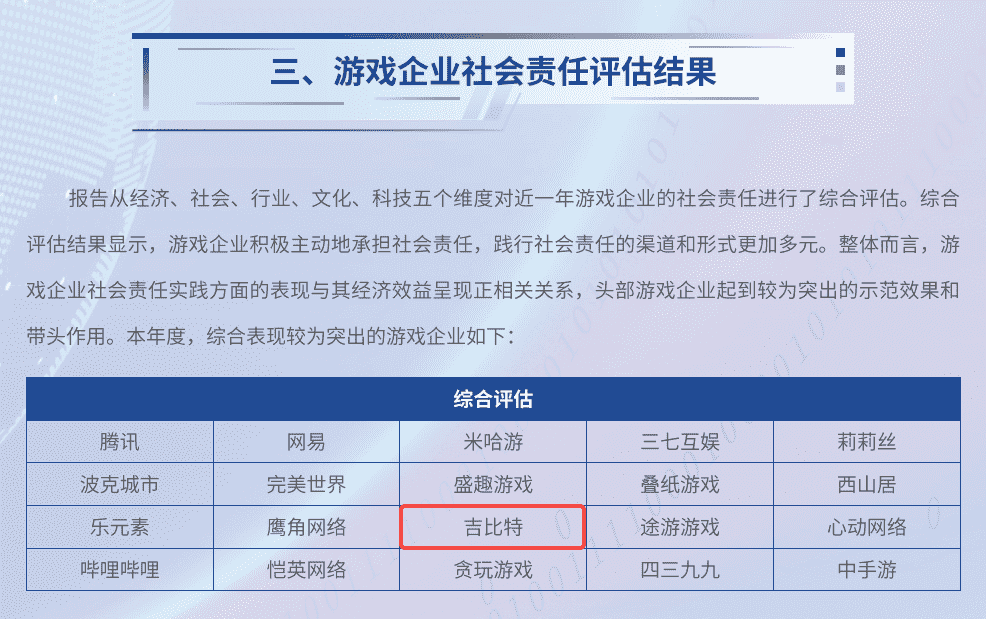 7月3日,,由中国音像与数字出版协会指导,,北京市西城区人民政府主办的“2024游戏责任论坛”在北京举行。。。论坛上,,,,人民网舆情数据中心、、、人民灵境研究院、、、、灵境 · 游戏实验室联合发布了《2023-2024游戏企业社会责任报告》(以下简称“《报告》”),,公布了游戏企业社会责任评估结果。。。。厦门J9.COM网络技术股份有限公司(以下简称“J9.COM”或“公司”)获评“2023-2024年度中国游戏企业社会责任综合表现较为突出企业”。。。这是继2020年以来,,J9.COM第五次入围人民网中国游戏企业社会责任相关荣誉榜单。。