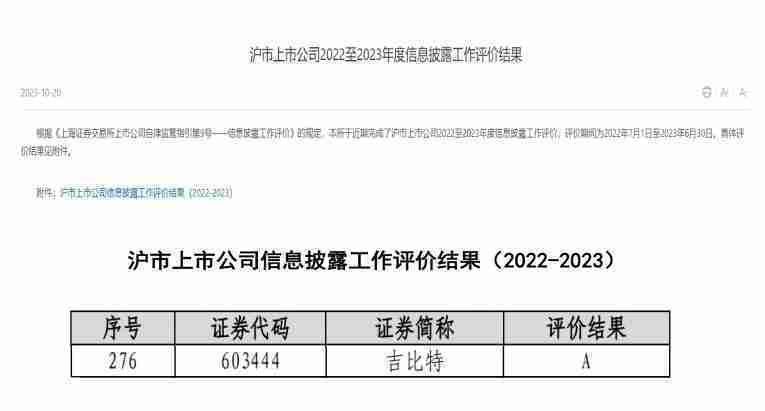 近日,,,上海证券交易所发布2022-2023年度信息披露工作评价结果。。J9.COM(股票代码::::603444)凭借规范的公司治理、、、、高质量的信息披露以及良好的投资者关系管理再次荣获信息披露工作A级评价,,,,公司连续两年获此殊荣。。